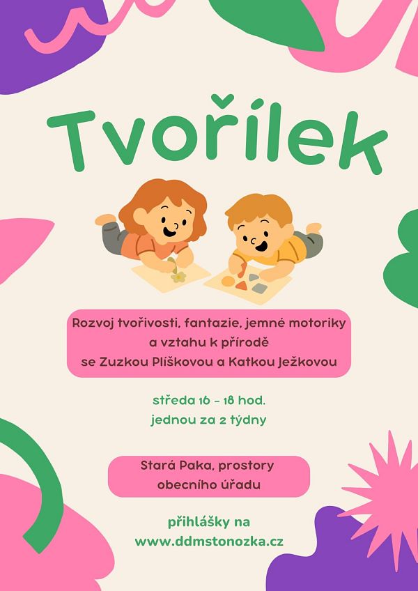Ještě máte možnost přihlásit děti ve věku 4-7 let do zájmového kroužku "Tvořílek", který za podpory obce Stará Paka organizuje DDM STONOŽKA. Kroužek bude probíhat v prostorách Obecního sálu Stará Paka. Kontakt p. Plíšková: 720 435 345.