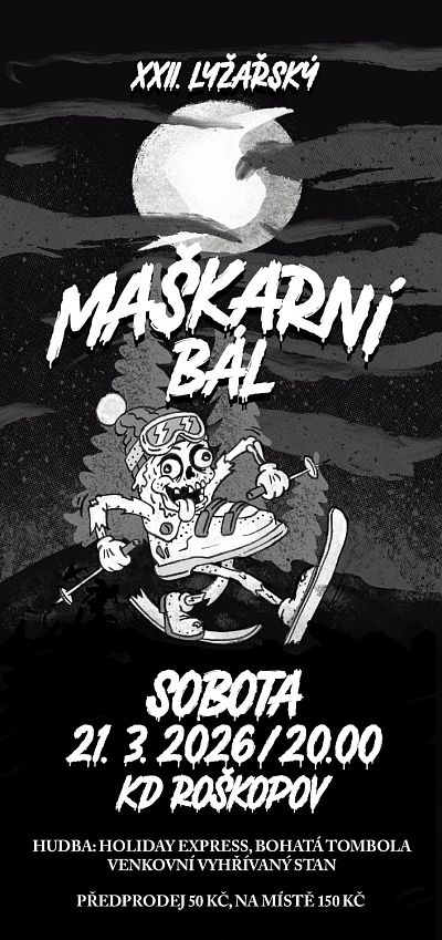 22. ročník tradičního Lyžařského maškarního bálu se uskuteční v sálu kulturním domě v Roškopově v sobotu 21.3.2026 od 20 hodin. Čeká vás rej masek, bohatá tombola a venkovní vyhřívaný stan s diskotékou. K tanci zahraje skupina Holiday Express z Jaroměře. Srdečně vás zvou staropačtí lyžaři.
