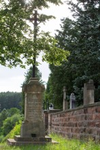 Umístěn u vchodu na hřbitov vpravo ve svahu před jižní stěnou hřbitova. Hranolový podstavec, dřík čelně zdoben reliéfem P. Marie lemovaný lomeným obloukem, přesahující římsa s trojúhelníkovými štíty s motivem božího oka. Vysoký plochý kovový kříž s Ukřižovaným Ježíšem.